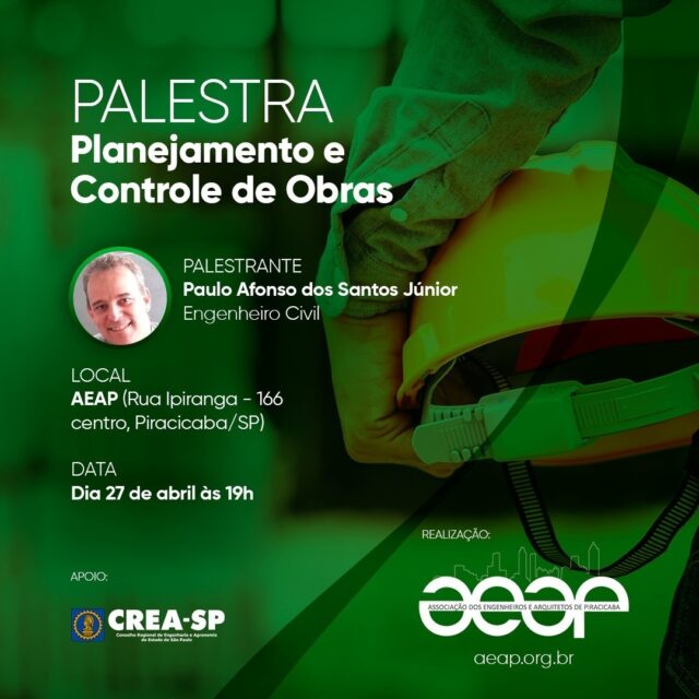 A AEAP (Associação dos Engenheiros e Arquitetos de Piracicaba) convida a todos a participarem da Palestra: Planejamento e Controle de Obras, que acontece no dia 27 de abril, às 19h00, na AEAP, localizada na Rua Ipiranga, número 166, no Centro de Piracicaba.
