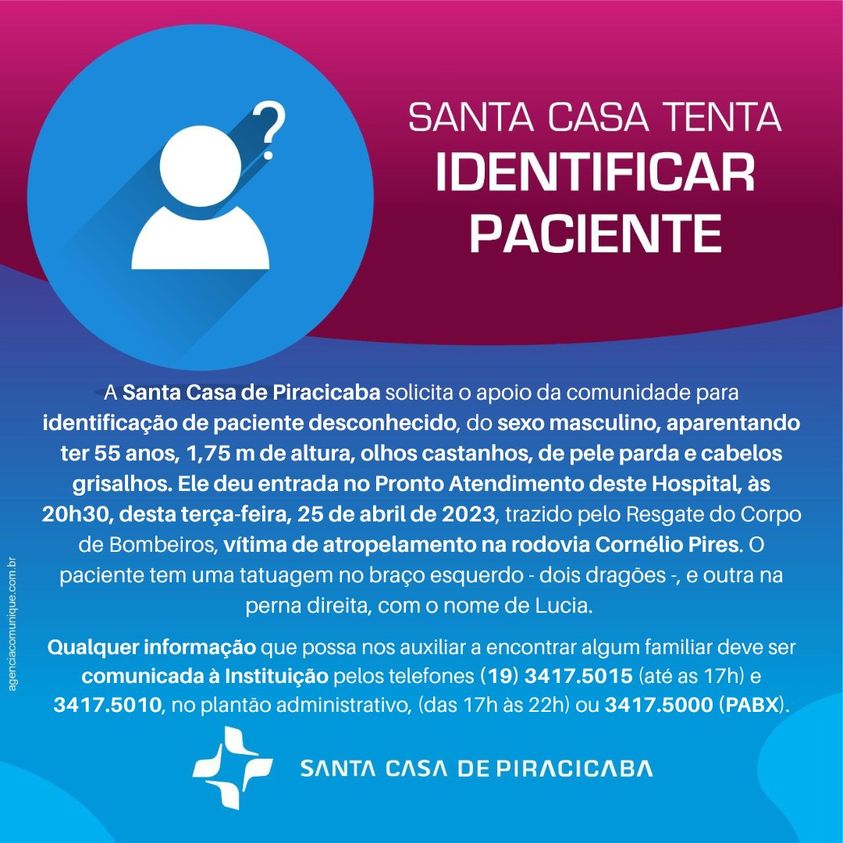 A Santa Casa de Piracicaba está pedindo ajuda para identificar o homem que foi encaminhado ao hospital na noite de ontem (25) após ser atropelado na Rodovia Cornélio Pires, que liga Piracicaba a Saltinho.