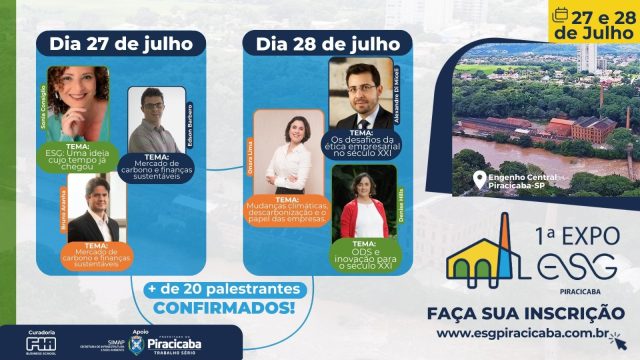 A 1ª Expo ESG Piracicaba, que será realizada no Engenho Central de 27 a 29 de julho, terá mais de 30 palestrantes e expositores, que apresentarão cases e discutirão estratégias e ideias dentro do escopo de meio ambiental, social e de governança. O evento tem apoio da Prefeitura de Piracicaba, por meio da Simap (Secretaria de Infraestrutura e Meio Ambiente), e segue com as inscrições, gratuitas, abertas pelo site esgpiracicaba.com.br, onde consta a programação completa da expo e o quadro de palestrantes.