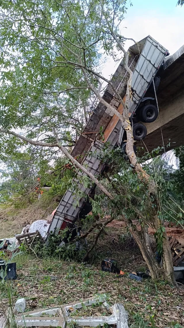 A carreta responsável pela segunda colisão ficou pendurada na ponte após o acidente. As condições das duas pessoas que estavam no veículo não foram detalhadas até o momento.