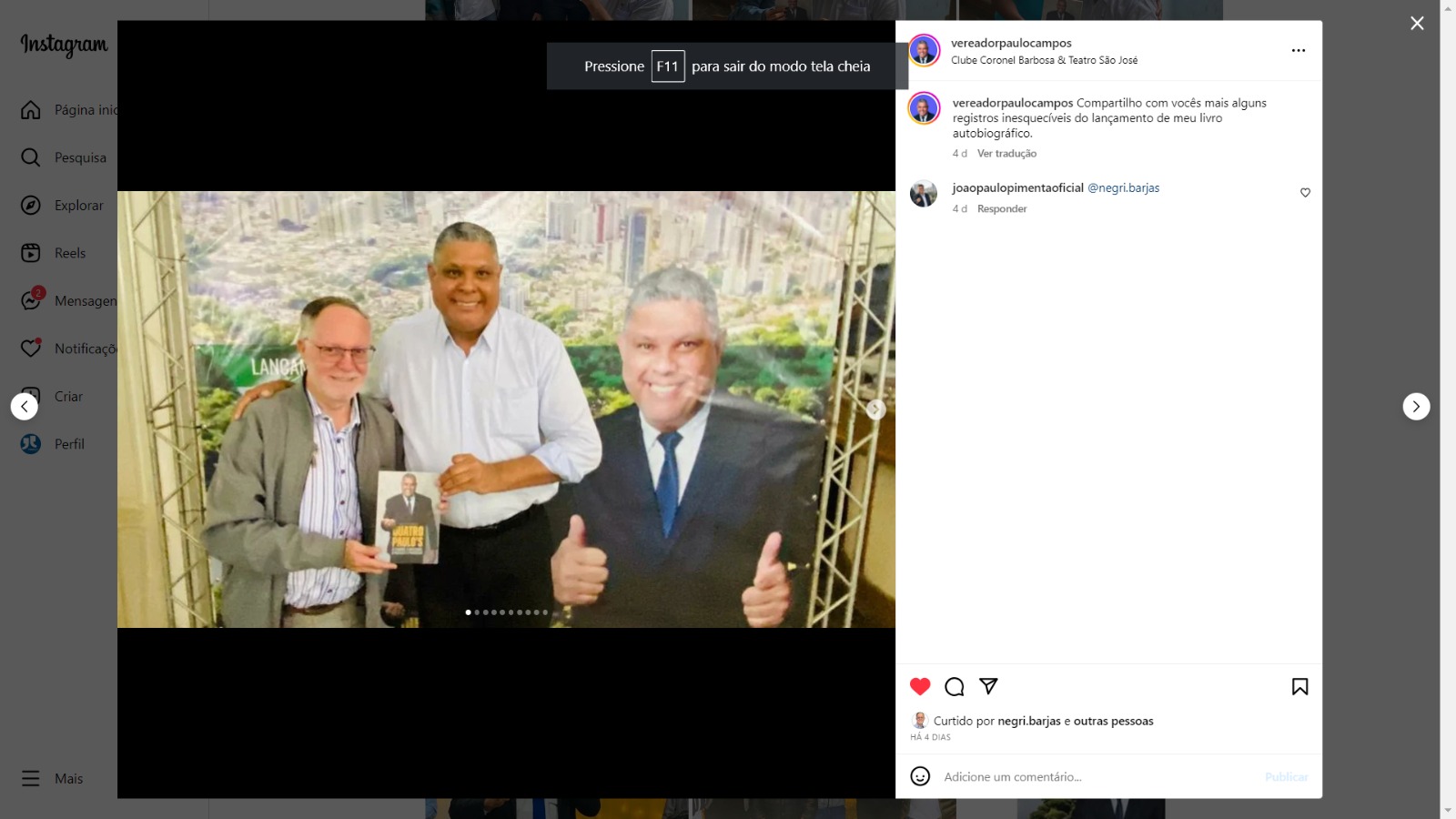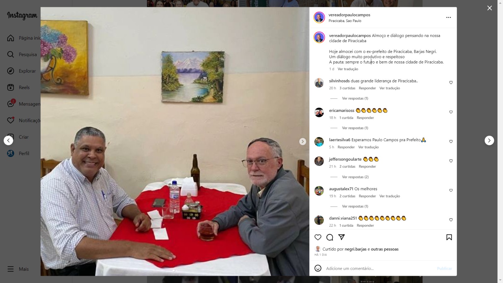 Através de suas contas no Instagram, Barjas Negri e Paulo Campos compartilharam dois encontros públicos. O primeiro ocorreu no lançamento do livro de Paulo Campos, realizado recentemente na cidade. O segundo encontro foi um almoço compartilhado entre os dois.
