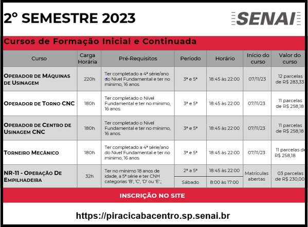 Mais informações consulte o site https://piracicabacentro.sp.senai.br