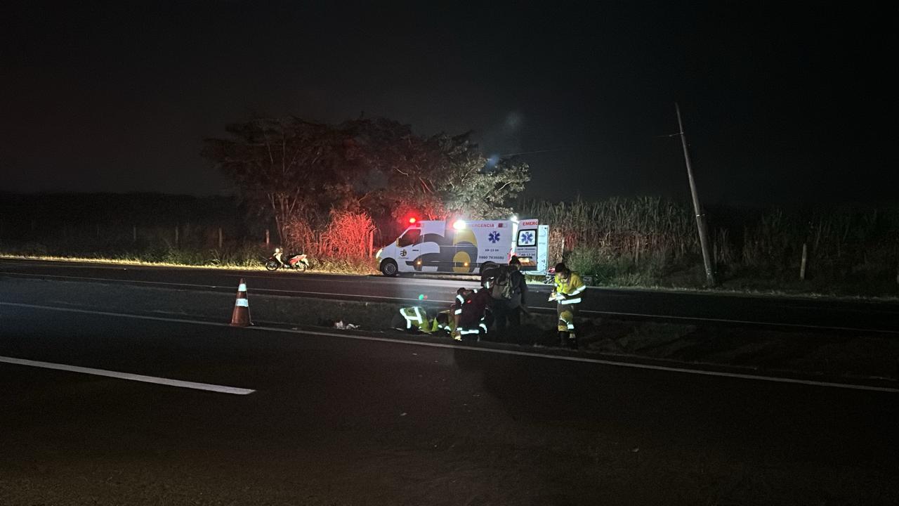 O primeiro acidente envolveu um veículo Fiat Palio e uma motocicleta de 150 cilindradas. De acordo com informações preliminares, a condutora do Palio estava parada no congestionamento, com o pisca-alerta acionado, quando o motociclista, de aproximadamente 30 anos, colidiu na traseira do veículo. A concessionária Colinas socorreu o motociclista, que foi levado em estado grave para o Hospital Fornecedores de Cana. No momento do socorro, ainda não havia presença da Polícia Rodoviária no local.
