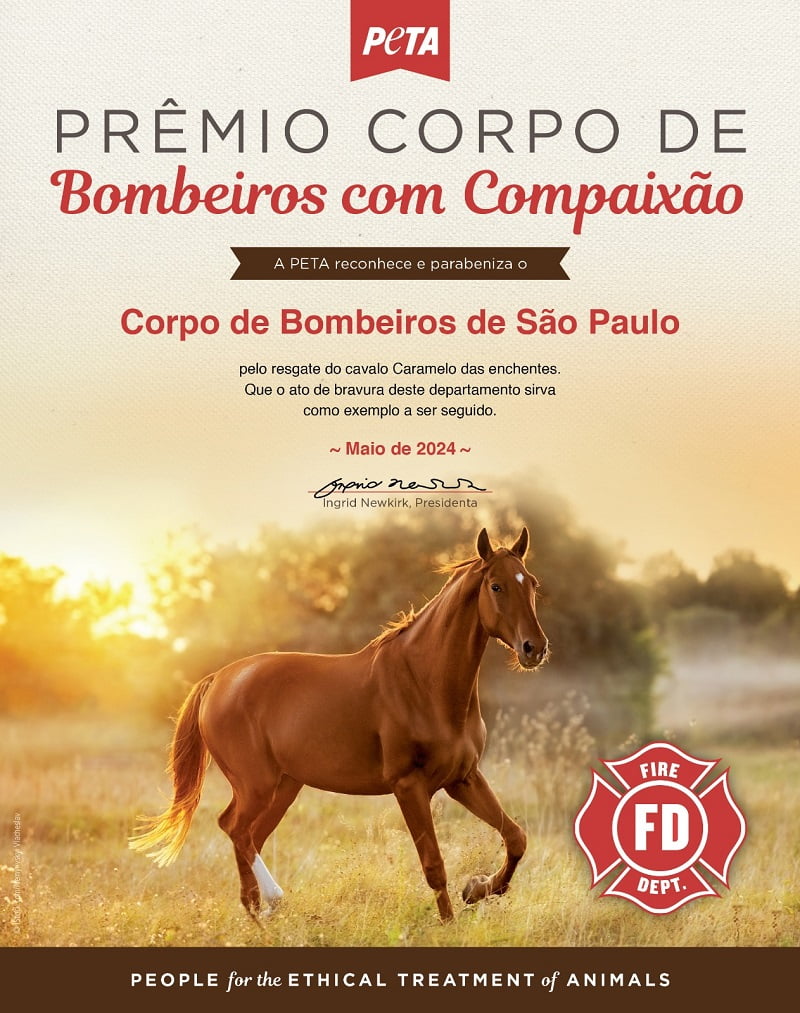 O Corpo de Bombeiros de São Paulo foi homenageado pelo resgate do cavalo Caramelo, realizado em Canoas, no Rio Grande do Sul, em 09 de maio. O prêmio é da organização não governamental Pessoas pelo Tratamento Ético dos Animais (Peta).