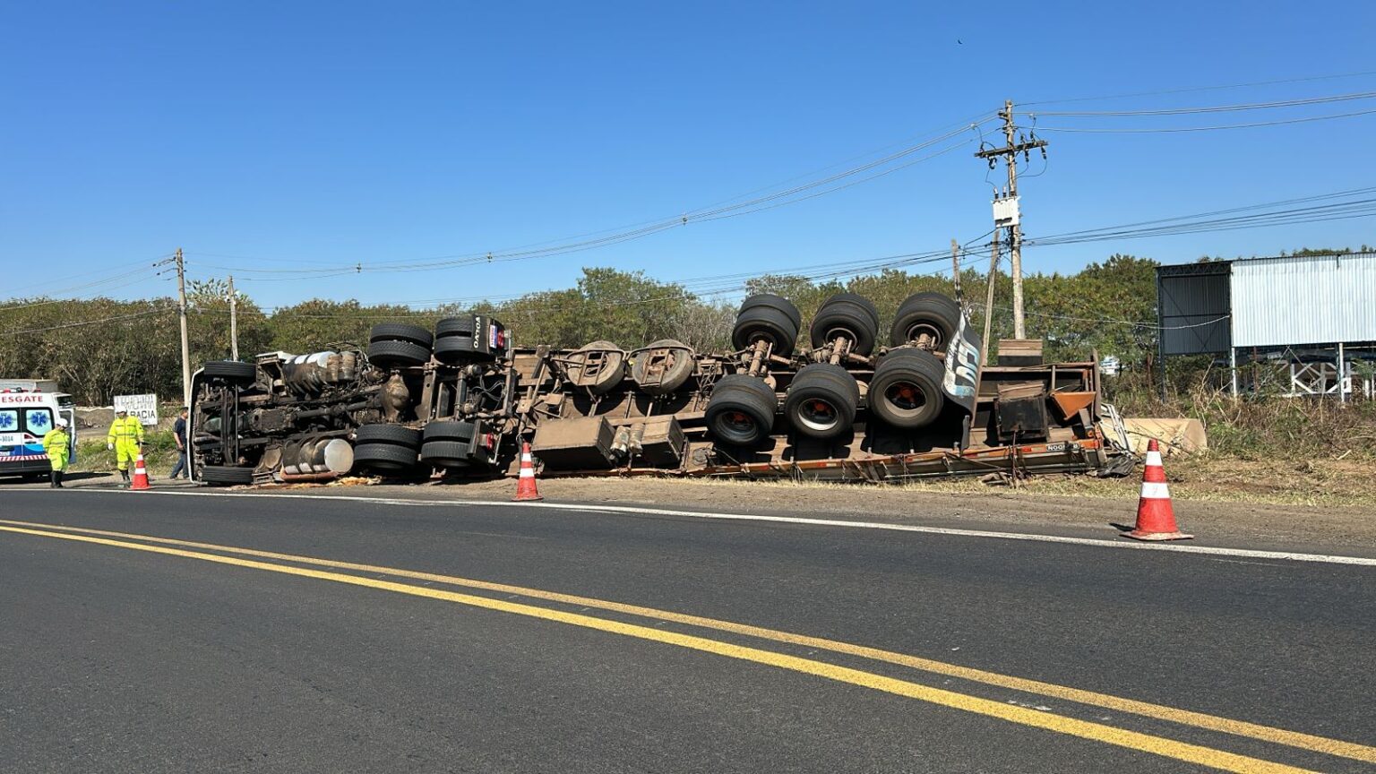 De acordo com relatos, a carga ‘puxou’, o que fez com que o motorista perdesse o controle do caminhão, resultando no tombamento. Felizmente, não houve feridos graves no acidente.