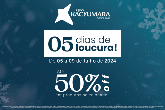 As Lojas Kacyumara iniciam uma promoção imperdível. De 05 a 09 de julho de 2024 acontece os “05 Dias de Loucura”, onde os clientes poderão aproveitar descontos de até 50% em uma ampla gama de produtos. A promoção inclui desde edredons sofisticados até peças de moda, além do setor de utilidades e itens de banho. Esta é uma oportunidade única para repaginar seu lar com descontos incríveis.