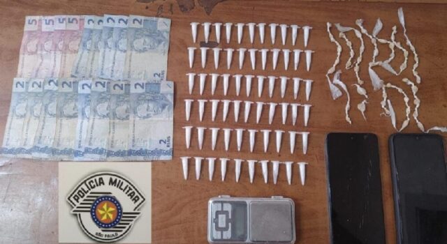 Durante a abordagem, a mulher confessou que traficava drogas junto com o marido e que escondia entorpecentes em suas partes íntimas. Na busca pela residência, foram encontrados 64 eppendorfs de cocaína, 54 porções de crack, R$ 46 em dinheiro e uma balança de precisão.