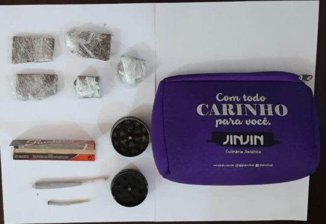 Durante a revista, os policiais localizaram uma mochila pertencente ao suspeito. Dentro dela, havia uma necessaire de cor roxa contendo cinco invólucros de uma substância esverdeada, aparentemente maconha, totalizando 50,5 gramas. Também foram encontrados um dichavador, dois cigarros de maconha (um deles parcialmente consumido) e folhas de seda.