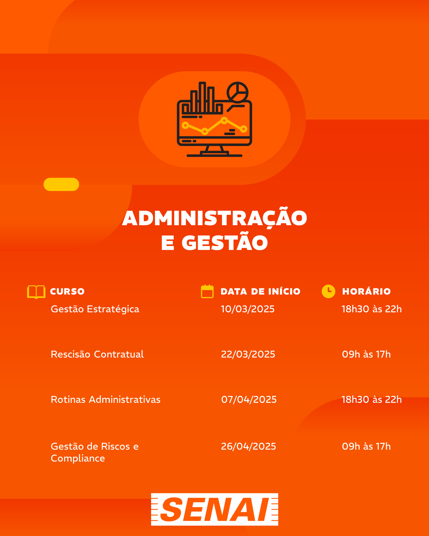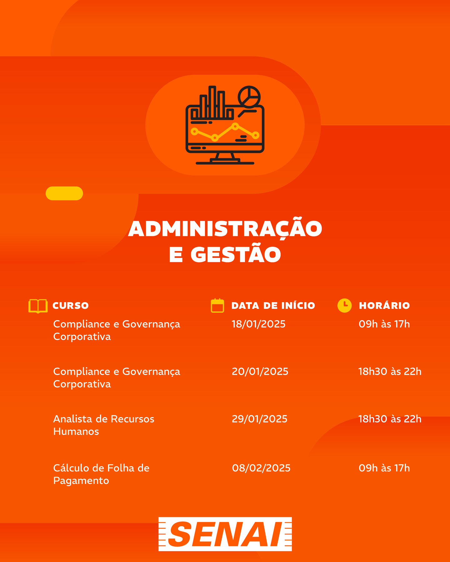 Confira abaixo os cursos por mês de início: