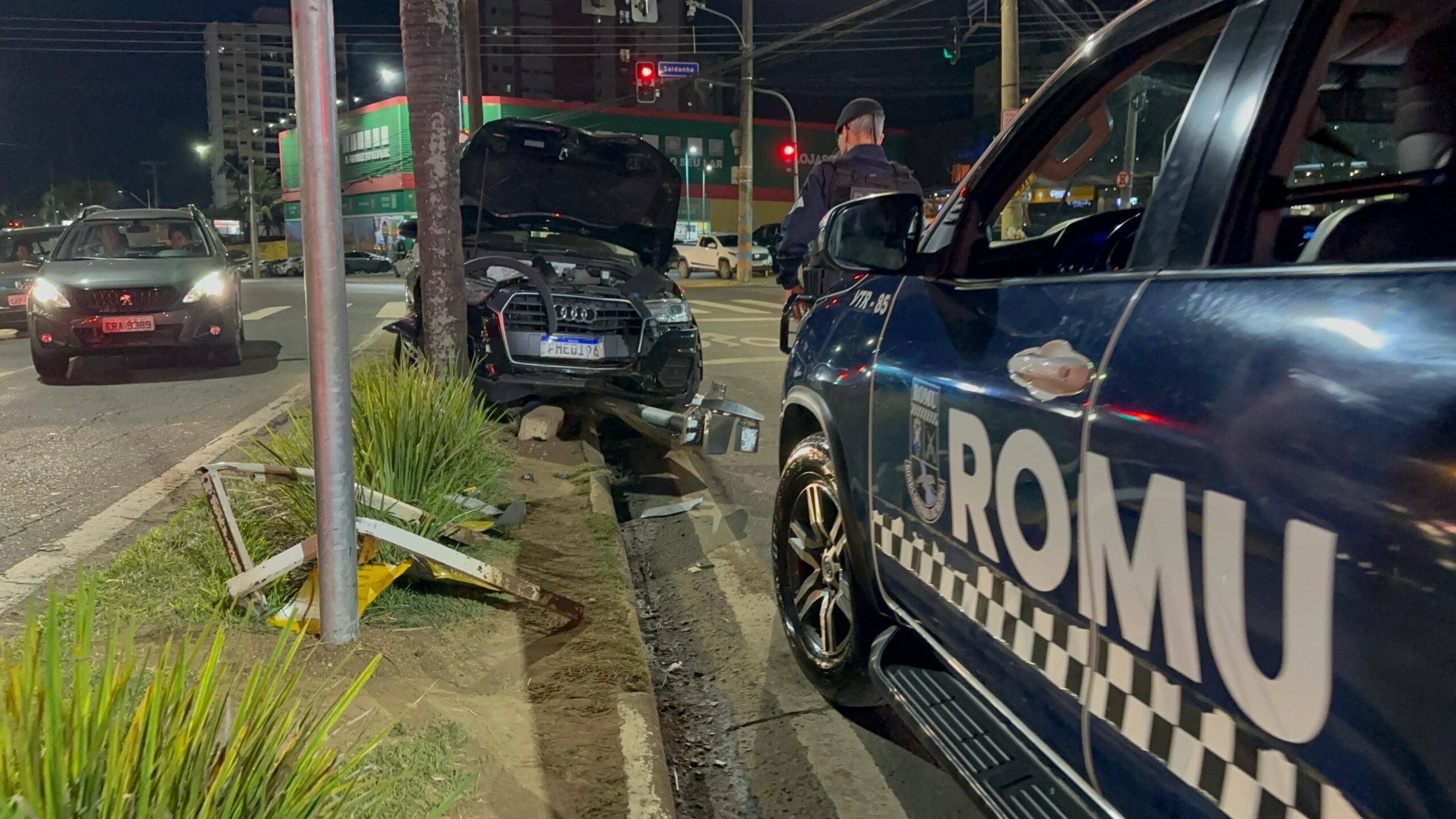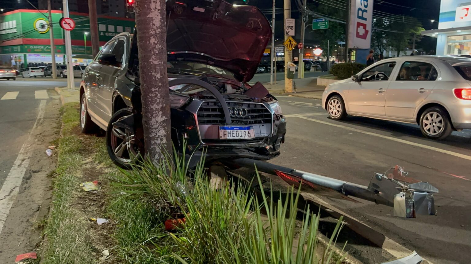 Na noite deste sábado (8), um acidente foi registrado no cruzamento da Avenida Independência com a Avenida Saldanha Marinho, em Piracicaba. Uma motorista de um Audi perdeu o controle do veículo, colidiu contra um coqueiro e ainda derrubou parte do radar de monitoramento de velocidade no local.