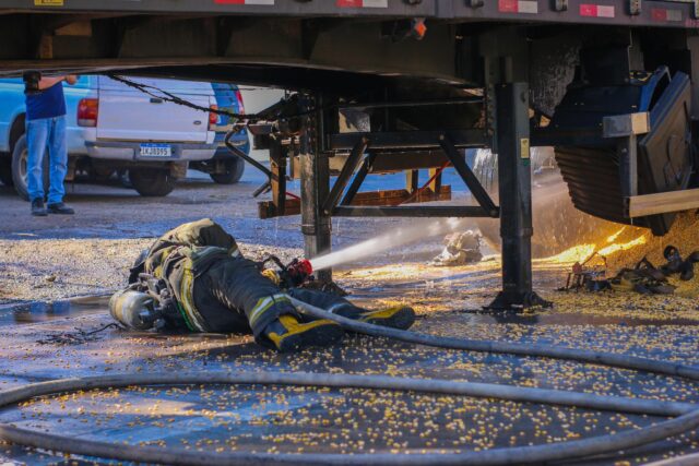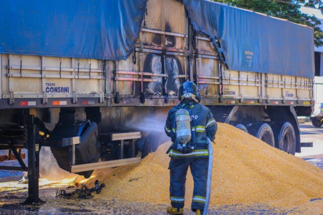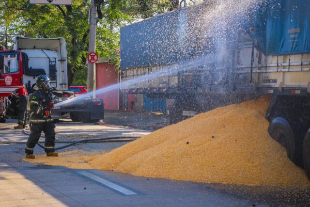 O Corpo de Bombeiros foi acionado e chegou rapidamente ao local. Enquanto isso, comerciantes e pedestres tentaram conter o fogo com extintores, mesmo com o risco de explosão, já que a carreta transportava botijões além da carga de milho.