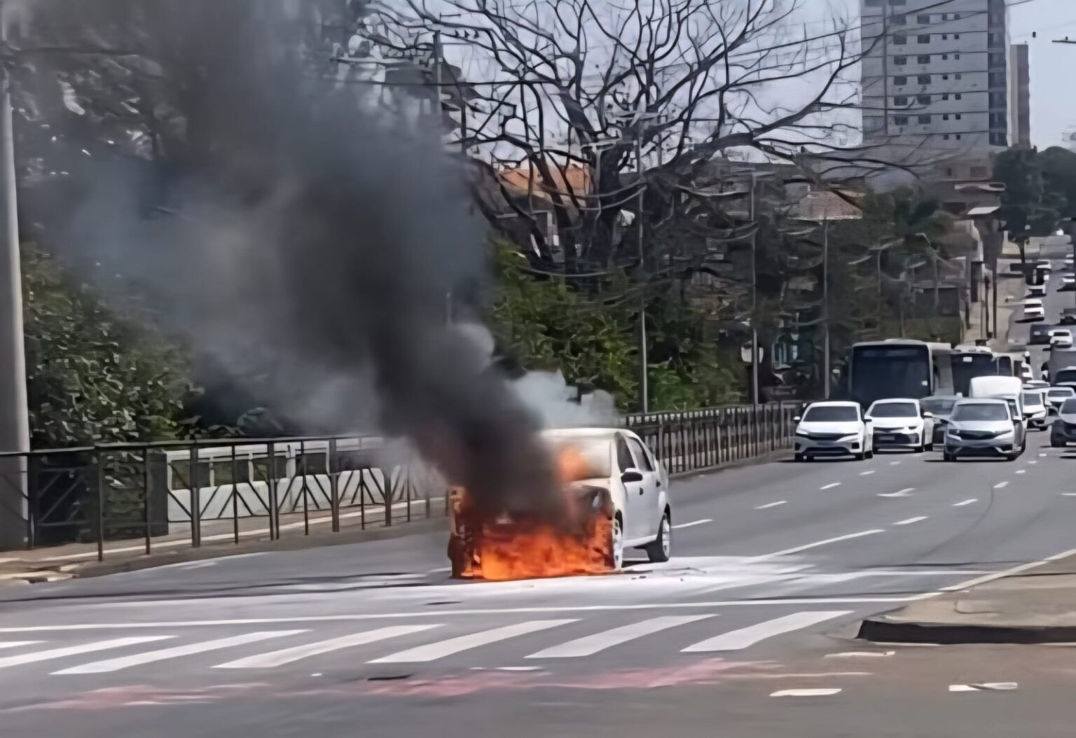 Um veículo Ford Fiesta pegou fogo na tarde desta quinta-feira (21) na Ponte do Mirante, em Piracicaba (SP). As chamas se alastraram rapidamente e destruíram completamente o carro.