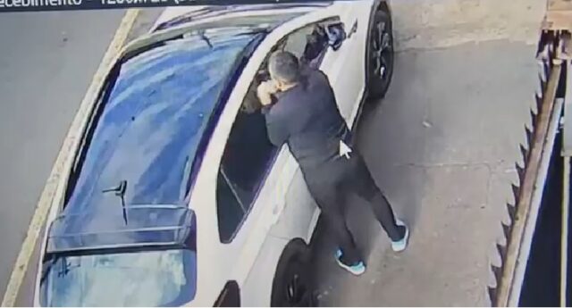 Segundo informações, o criminoso — um homem bem vestido — quebrou o vidro do carro da vítima e, em pouco mais de dez segundos, levou pertences pessoais antes de fugir.
