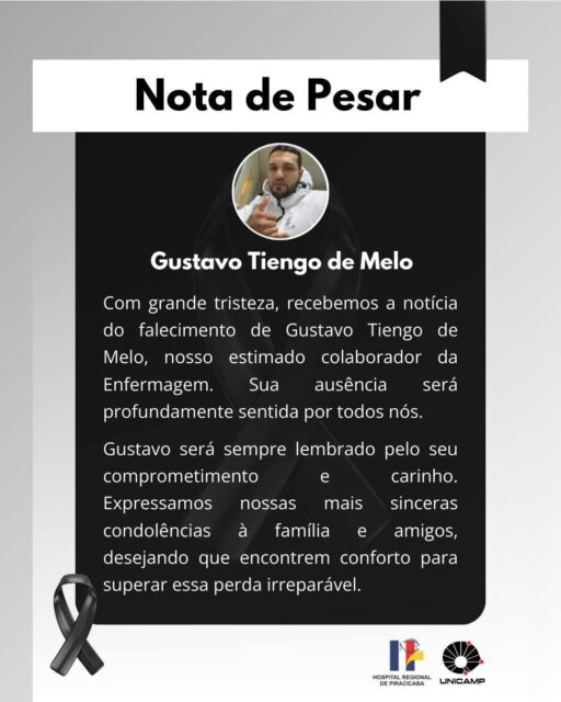 “Com grande tristeza, recebemos a notícia do falecimento de Gustavo Tiengo de Melo, nosso estimado colaborador da enfermagem. Sua ausência será profundamente sentida por todos nós. Gustavo será sempre lembrado pelo seu comprometimento e carinho. Expressamos nossas mais sinceras condolências à família e amigos, desejando que encontrem conforto para superar essa perda irreparável.”