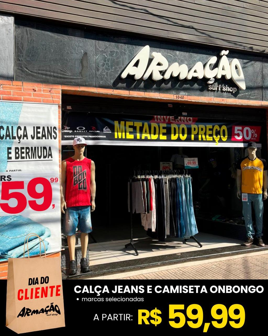 Essa semana é toda do cliente Armação. Para comemorar, a loja preparou ofertas imperdíveis que cabem no bolso: calças jeans a partir de R$59,99 e camisetas Onbongo a partir de R$59,99. É estilo de verdade com preços que só podem ser encontrados na Armação.