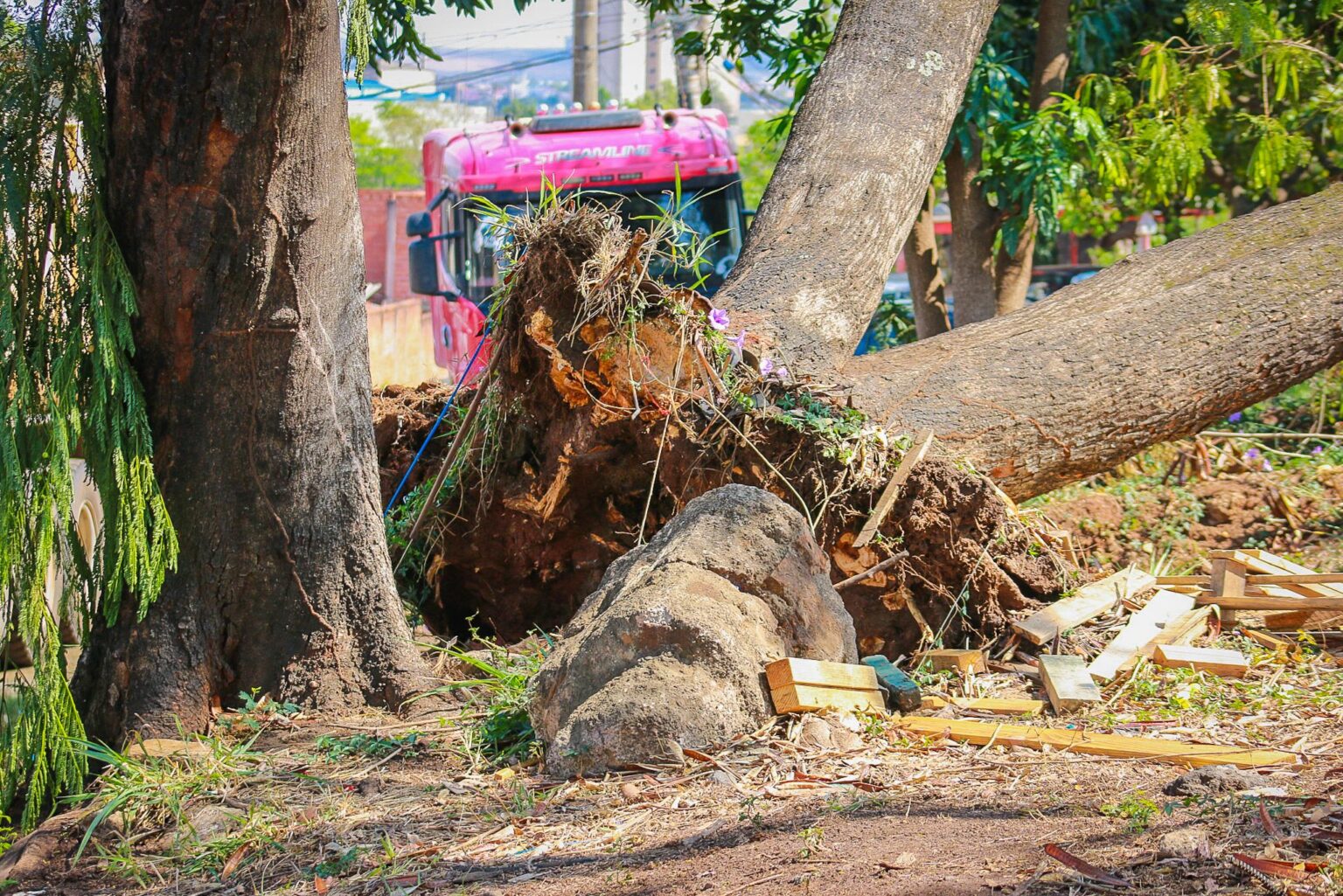 De acordo com as informações iniciais, ninguém foi ferido, e a árvore ainda não foi removida.