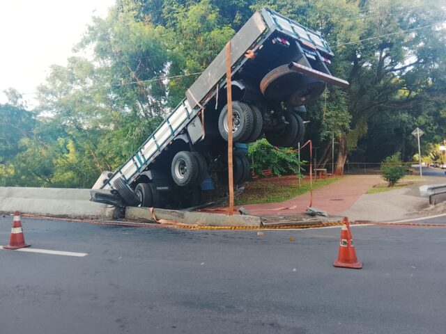 Com o impacto, a traseira do caminhão ficou inclinada em direção ao rio, e parte da carga de postes se espalhou pela via. Segundo informações preliminares, o veículo descia a avenida quando ocorreu o acidente.