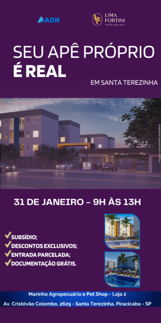A Lima Fortini Gestão Imobiliária, em parceria com a ADN Construtora, promove neste sábado (31) um evento especial voltado a quem deseja conquistar o primeiro apartamento próprio em Piracicaba. A ação será realizada no bairro Santa Terezinha e reúne condições exclusivas de financiamento e compra, válidas apenas durante o evento.