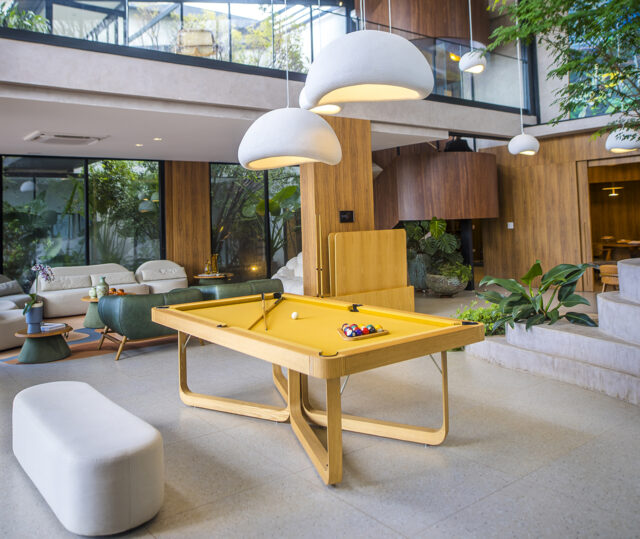 O lazer é um dos pontos altos da casa. O home cinema, com capacidade para até 12 pessoas, conta com tecnologia de última geração. O salão de jogos abriga uma exclusiva mesa de sinuca Mula Preta, enquanto a área gourmet, equipada com mesa de madeira maciça, integra os ambientes internos e externos, criando um espaço ideal para receber convidados.