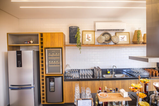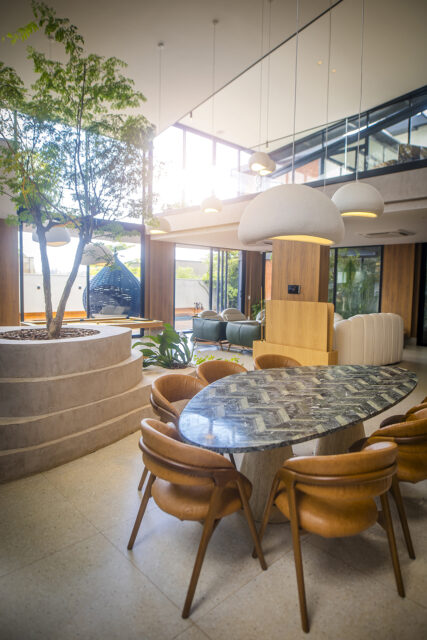Os ambientes sociais incluem uma sala de estar ampla e acolhedora, sala de jantar com mesa em mármore marchetada e cozinha planejada, com possibilidade de fechamento para maior privacidade. Um dos destaques do projeto é a praça interna com árvore tataré, que traz leveza e conexão com a natureza ao interior da residência.