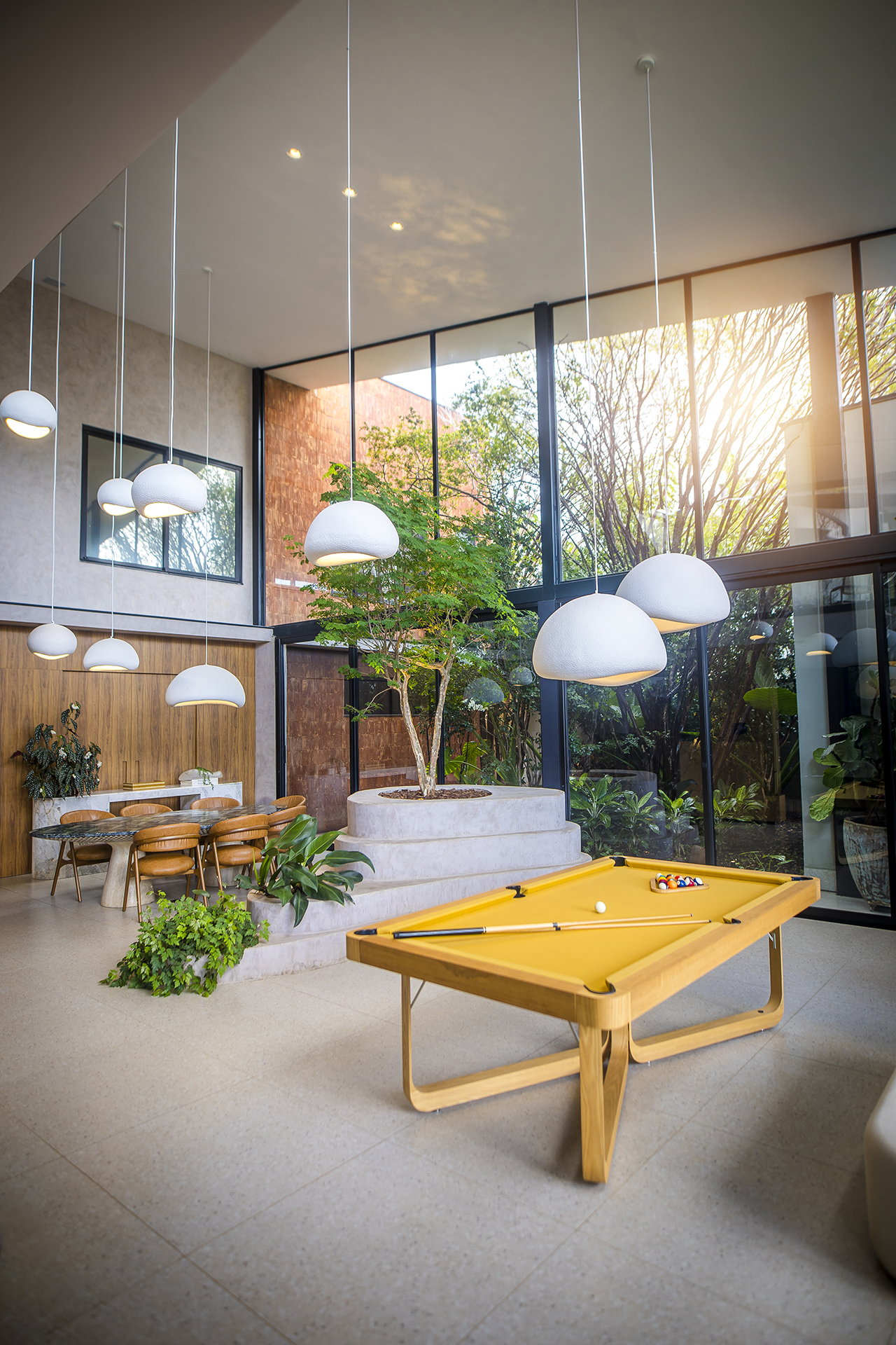 Os ambientes sociais incluem uma sala de estar ampla e acolhedora, sala de jantar com mesa em mármore marchetada e cozinha planejada, com possibilidade de fechamento para maior privacidade. Um dos destaques do projeto é a praça interna com árvore tataré, que traz leveza e conexão com a natureza ao interior da residência.