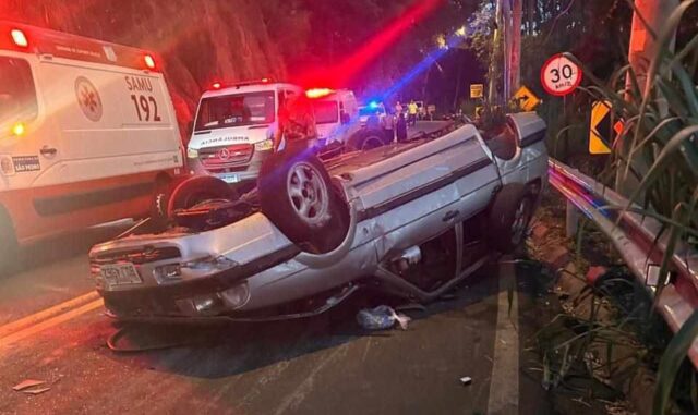 Segundo as primeiras informações, o veículo VW Santana teria apresentado uma pane mecânica antes de perder o controle e capotar.