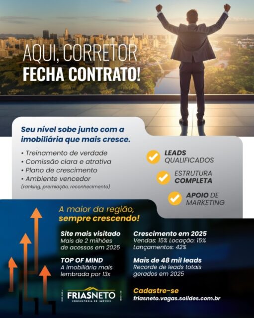 Para quem deseja iniciar uma nova fase profissional, a Frias Neto está com processo seletivo aberto para corretor associado. A oportunidade é voltada para pessoas com perfil comercial, foco em resultados, disposição para aprender e vontade de crescer.