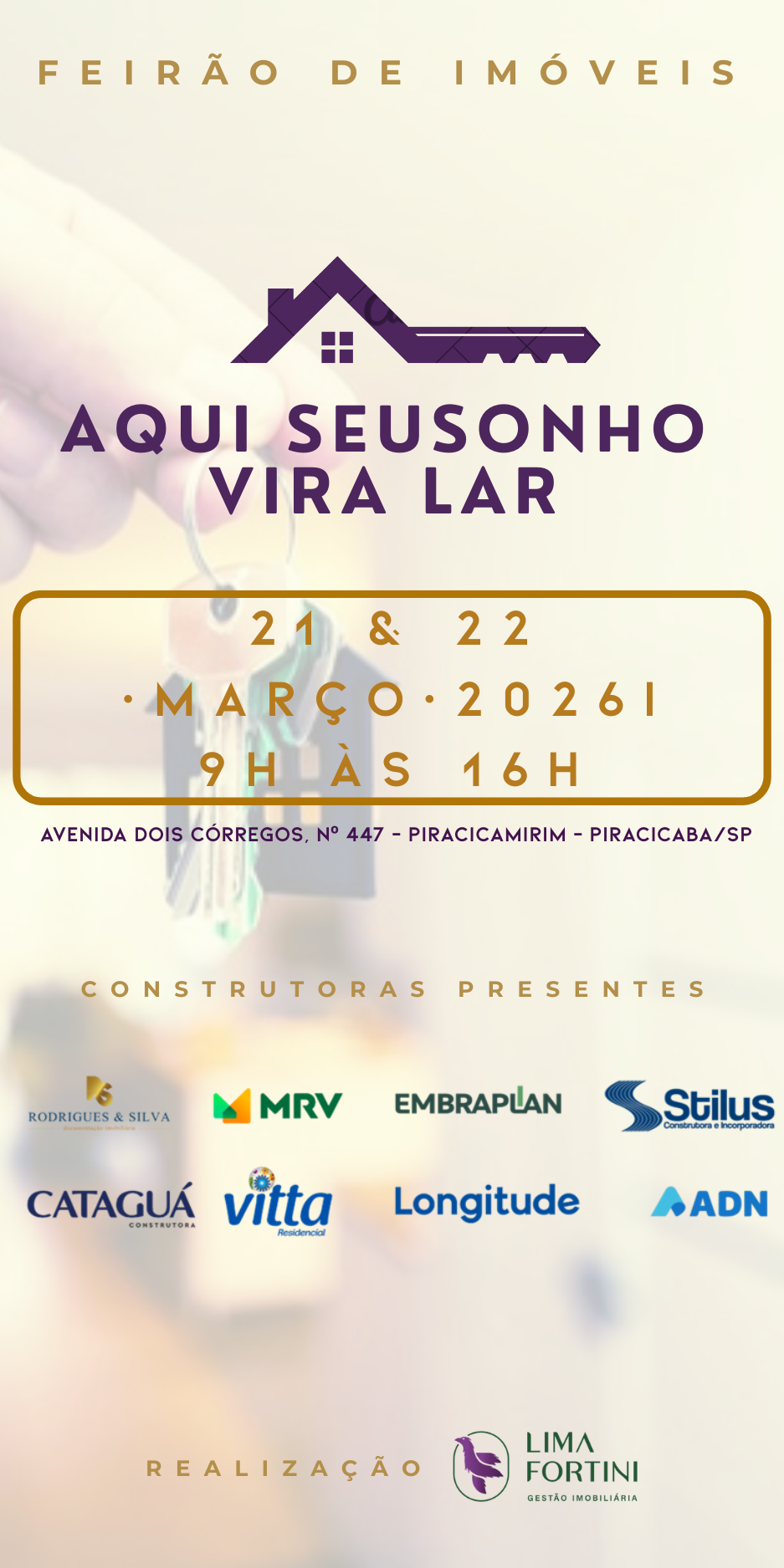 O evento será realizado pela Lima Fortini Gestão Imobiliária, na Avenida Dois Córregos, 447, Piracicamirim, em Piracicaba, em um ambiente preparado para oferecer atendimento completo e personalizado.