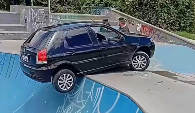 Um Fiat Palio foi encontrado na manhã da última terça-feira (25) “enroscado” na borda da pista de skate...