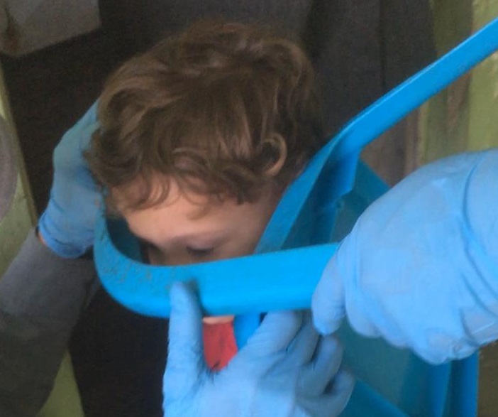 Criança com cadeira de plástico entalada na cabeça é socorrida pelos bombeiros