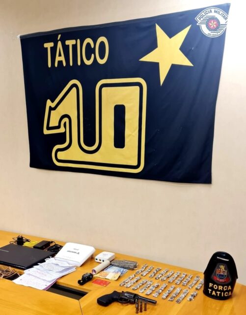 No local foram encontrados um revólver calibre 38 com seis munições dentro e sem numeração, uma sacola plástica contendo 196 porções de maconha, um notebook que suspostamente seria usado para a realização de uma videochamada pela organização criminosa e quatro celulares.