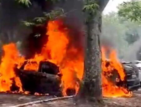 Carro é tomado completamente por chamas em estacionamento da Rua do Porto em Piracicaba