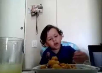 Em um vídeo gravado pela mãe, o pequeno Luis Antônio se recusa a comer carne de polvo. Ele argumenta que ...