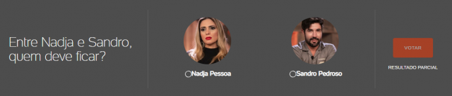 De acordo com o UOL, site tradicional por fazer pesquisas de eliminação de reality-shows, a Enquete A Fazenda 10 aponta que Sandro deve ser o eliminado da segunda Roça. Isso porque, às 12h16 desta quarta, 60% dos votos eram para que Nadja ficasse no programa.