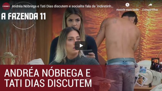 O clima já esquentou em A Fazenda 11. Andréa Nóbrega não gostou do comentário de Tati Dias sobre seu estilo e pediu que peoa parasse de “indiretinhas”. Veja o que aconteceu, no vídeo acima.
