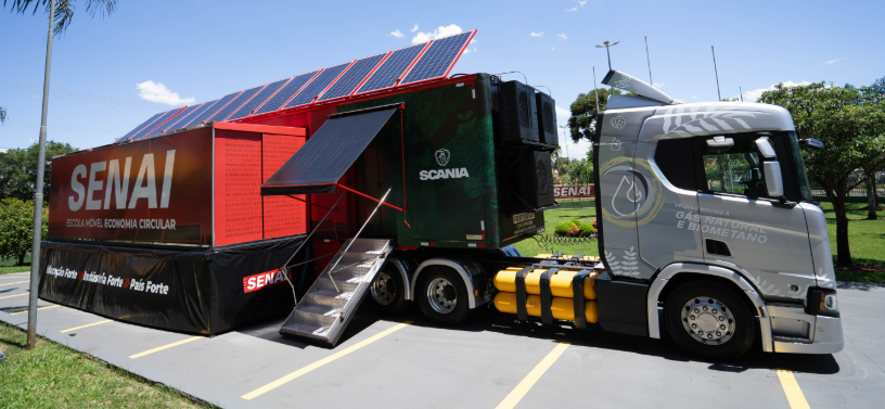 A escola móvel de Economia Circular do SENAI-SP é uma parceria com a empresa SCANIA, que disponibilizou para o projeto, em formato de comodato, um caminhão movido a biometano combustível, garantindo menos emissão de carbono nas viagens pelo estado de São Paulo.