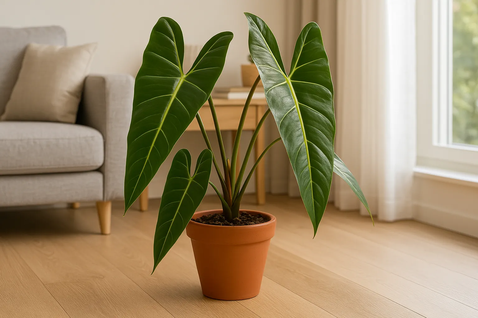Com regas regulares e substrato bem drenado, o filodendro Bernardo cresce forte e saudável.