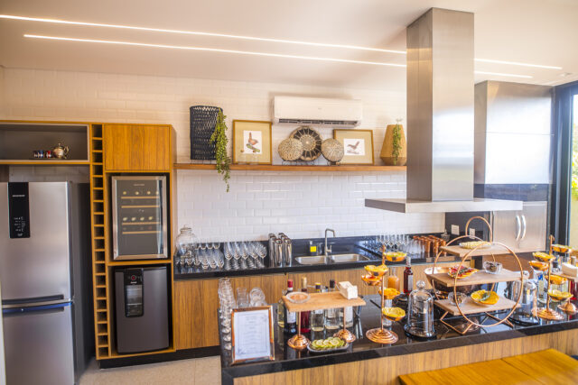 Os ambientes sociais incluem uma sala de estar ampla e acolhedora, sala de jantar com mesa em mármore marchetada e cozinha planejada, com possibilidade de fechamento para maior privacidade. Um dos destaques do projeto é a praça interna com árvore tataré, que traz leveza e conexão com a natureza ao interior da residência.